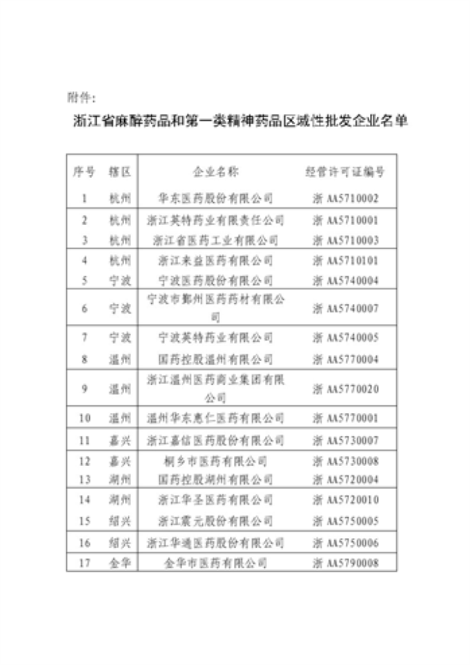 浙江省麻醉藥品和第一類精神藥品區域性批發企業名單