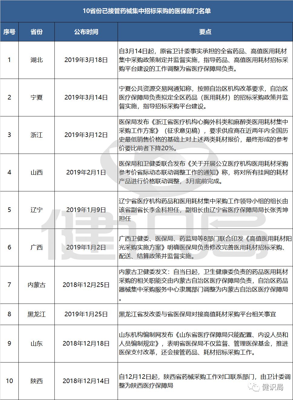 據健識君統計,除了上海、福建等早已試點醫保主導藥采的城市外,包括湖北在內,目前已有至少10個省份發文,明確將藥械集采環節政策制定與監督實施等職能,交由醫保部門負責。