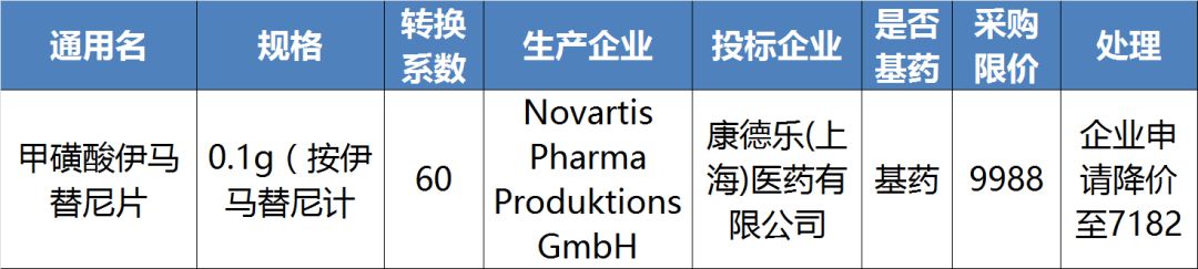 3月26日,甘肅省發布通知,由于北京諾華制藥有限公司主動申請,其代理的甲磺酸伊馬替尼片(格列衛,流水號1111894,0.1g*60),在甘肅省集中采購平臺的中標價格由9998元/盒降為7182元/盒,調整后價格自2019 年4月1日起在全省執行。與此同時,該產品的原代理權由甘肅重藥醫藥有限公司變更為北京諾華制藥有限公司。